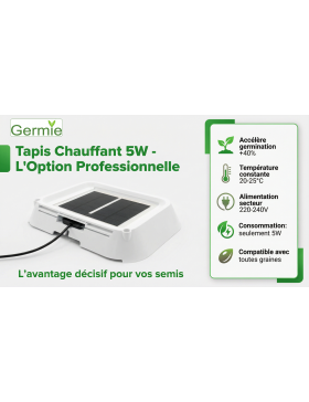 - Tapis chauffant pour semis qui maintient une température de sol constante, favorisant une germination plus rapide et plus régulière, particulièrement utile en début de saison ou en intérieur frais.