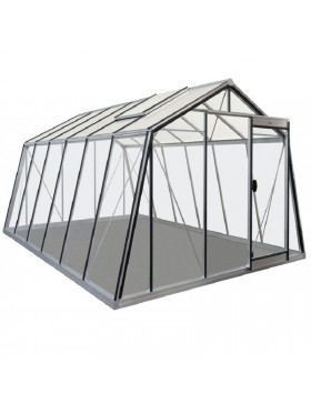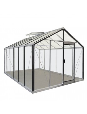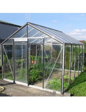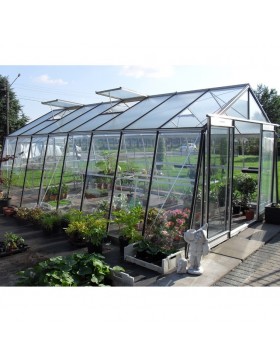 Zeer grote tuinkas met een natuurlijke aluminium constructie en 4...mm transparant gehard glas op de wanden en het dak.