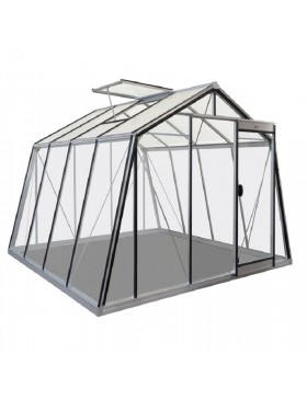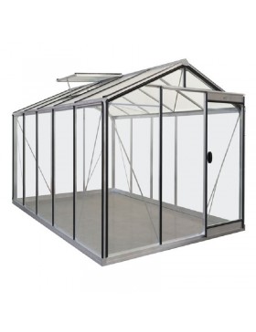 Tuinkas met een natuurlijke aluminium constructie en 4 mm helder...gehard glas op de wanden en een kathedraal (gehamerd) op het dak.