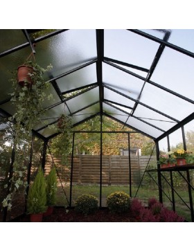 Tuinkas met zwart gelakte aluminium constructie, 4 mm helder...gehard glas op de wanden en kathedraalglas (gehamerd) op het dak.