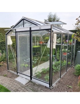 Tuinkas met zwart gelakte aluminium constructie (Ral 9005) en 4...mm helder gehard glas op de wanden en kathedraal (hamerslag) op het dak.