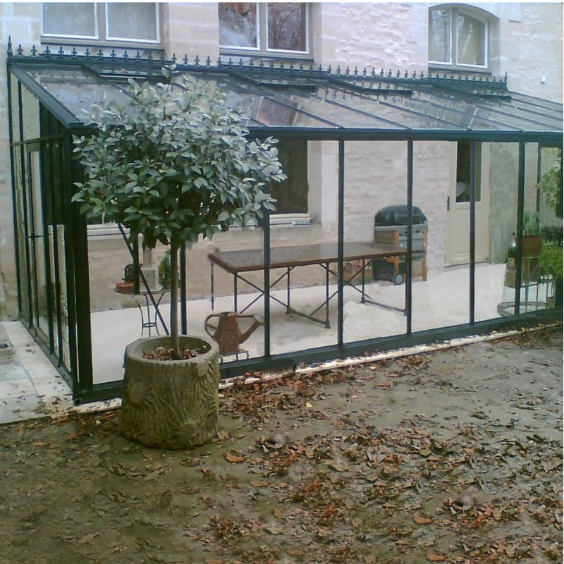 Aanbouwserre, wintertuin, Janssens van zeer hoge kwaliteit in 4mm gehard glas en zwart of groen gelakte aluminium constructie.