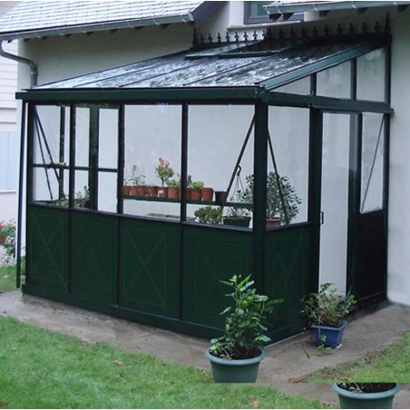 Deze kas is verkrijgbaar in zwart of groen gelakt aluminium en met glasbreedtes van 37 cm of 73 cm: kies de kas die het beste bij u past! En als u andere afmetingen of opties wenst (deuren, ramen, enz.), neem dan gerust contact met ons op.