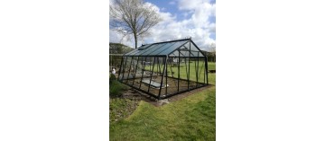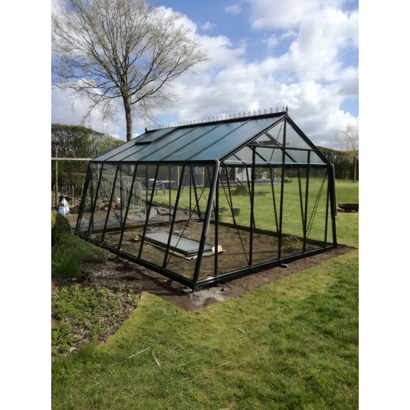 Tuinkas met zwart gelakte aluminium constructie (Ral 9005) en 4 mm helder gehard glas op de wanden en kathedraal (hamerslag) op het dak.
