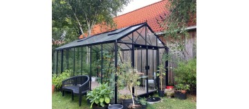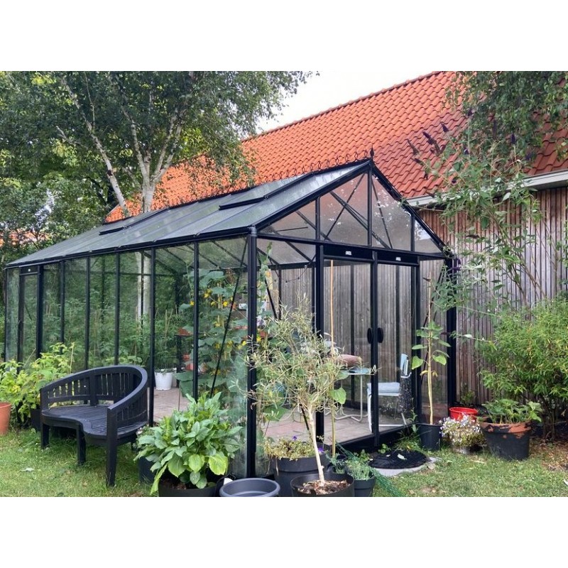 Tuinkas met zwart gelakte aluminium constructie (Ral 9005) en 4 mm helder gehard glas op de wanden en kathedraal (hamerslag) op het dak.