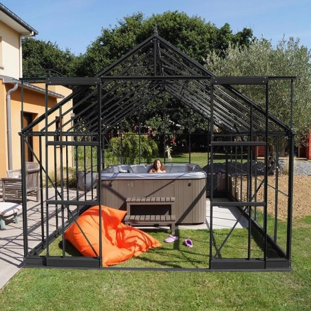Extra grote kas (3 m breed x 4,87 m lang x 2,60 m hoog) voorzien van een dubbele schuifdeur, vier dakramen, een Victoriaans fries met twee geïntegreerde goten, een basis met een verlaagde deurdrempel en extra verstevigingen onder het dak en de wanden voor een verhoogde windweerstand. (exclusief bij Ciel mon jardin!) .