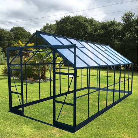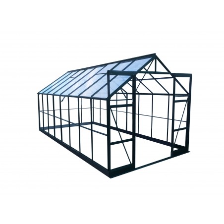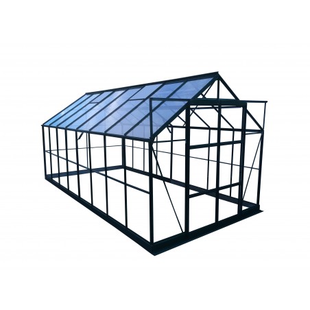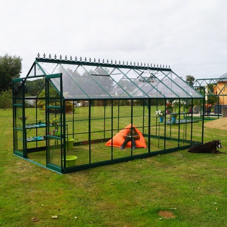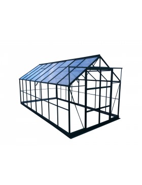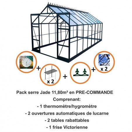 Jade 1180 VT kas voorzien van een dubbele schuifdeur, vier dakramen, automatische raamopener, thermometer/hygrometer, twee geïntegreerde goten en een onderbouw met verlaagde deurdrempel.