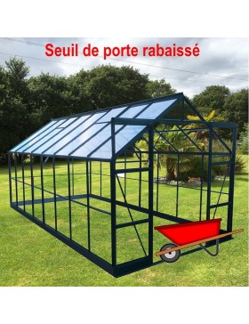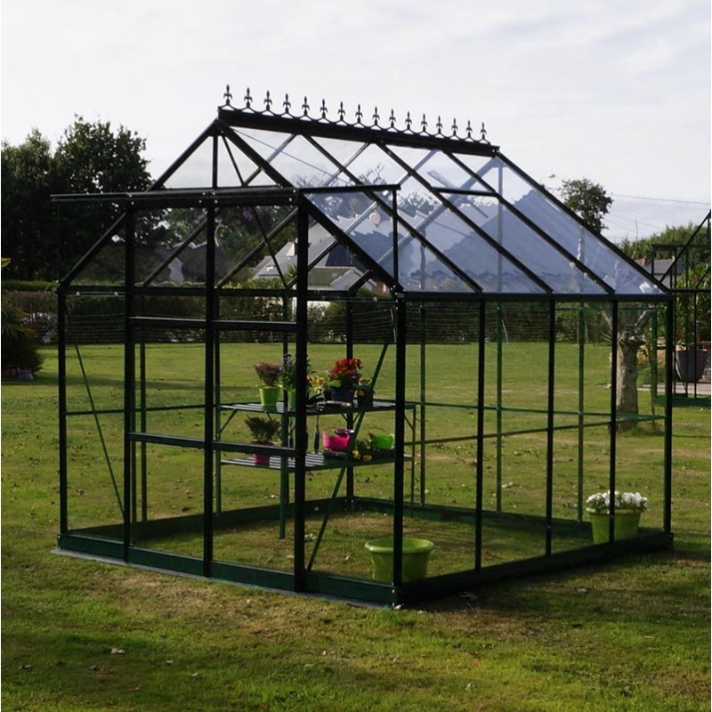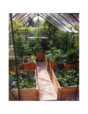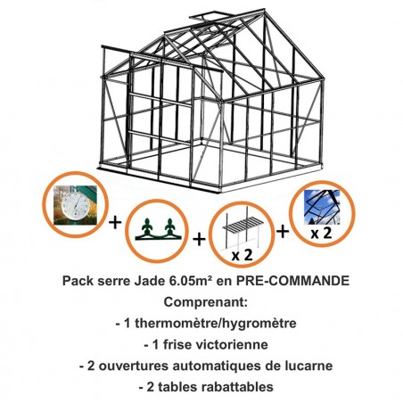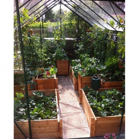 Jade 600 VT kas voorzien van een dubbele schuifdeur, twee dakramen, automatische raamopener, thermometer/hygrometer, twee geïntegreerde goten en een onderbouw met verlaagde deurdrempel.