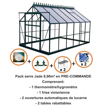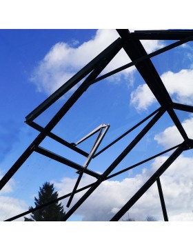 Jade 890 VT kas voorzien van een dubbele schuifdeur, twee dakramen, automatische raamopener, thermometer/hygrometer, twee geïntegreerde goten en een onderbouw met verlaagde deurdrempel.