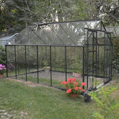 Tuinkas met zwart gelakte aluminium constructie en 4 mm gehard glas.